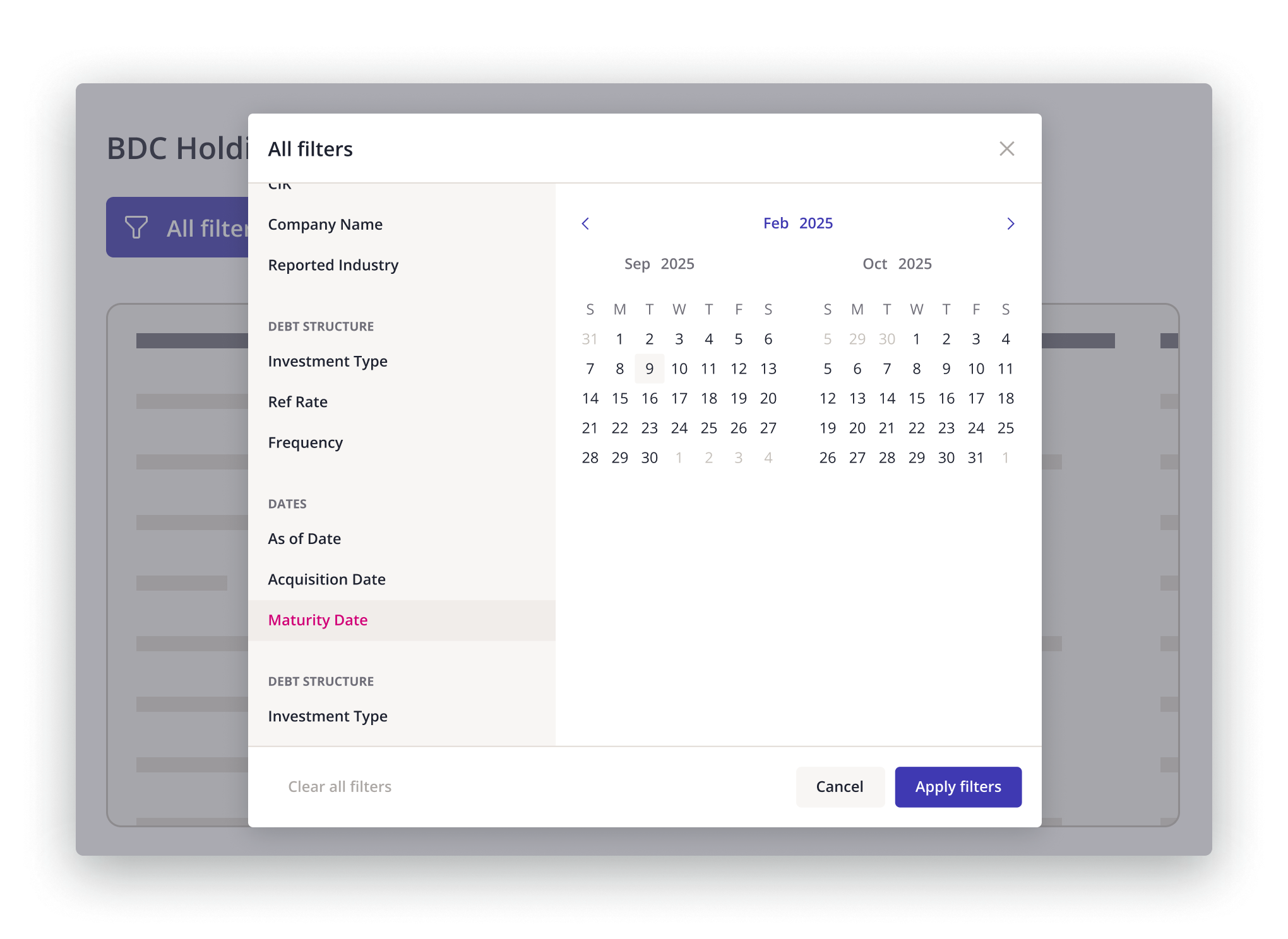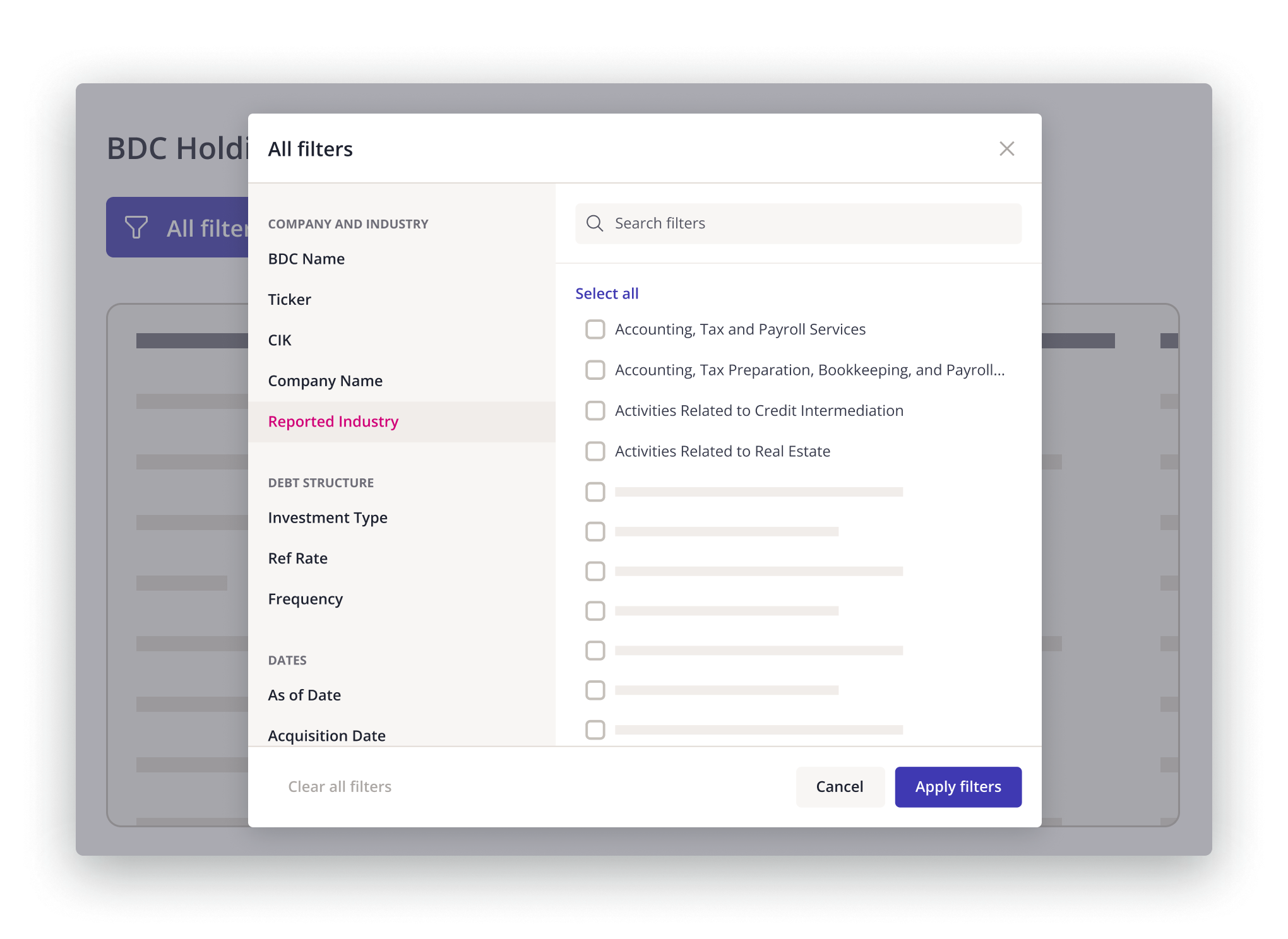 Search across all BDC underlying investments using a wide range of filters to narrow down your results by company and industry, valuation and yield, reported date, acquisition and maturity dates, and debt structure. You can also export your search results in Excel format for offline analysis.