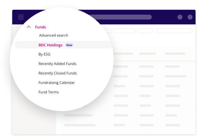 BDC holdings data is available via ‘Search For’ > ‘Funds’ > ‘BDC Holdings’ and in fund profiles under ‘BDC Holdings’ in the ‘Deals/Assets’ tab.