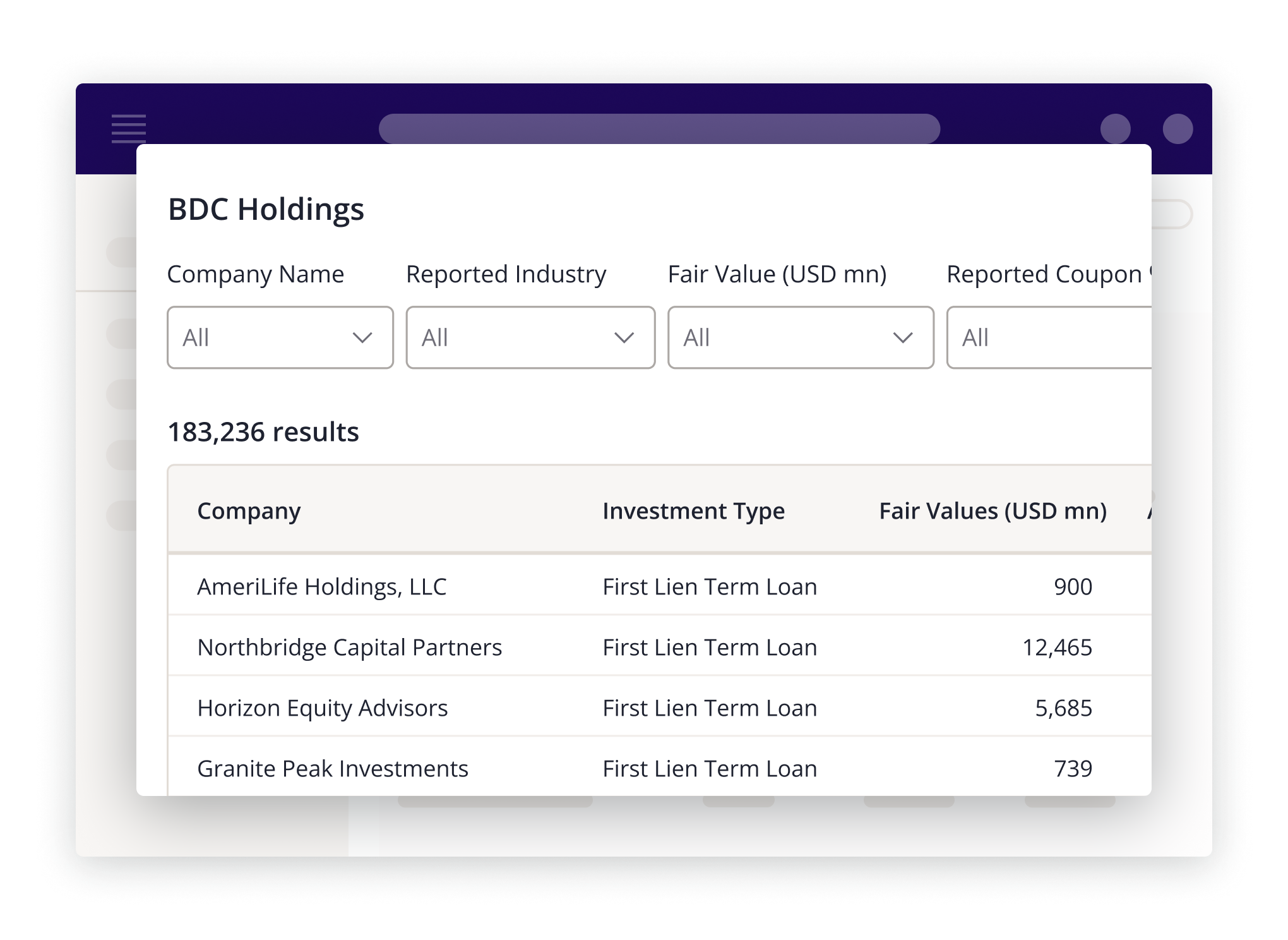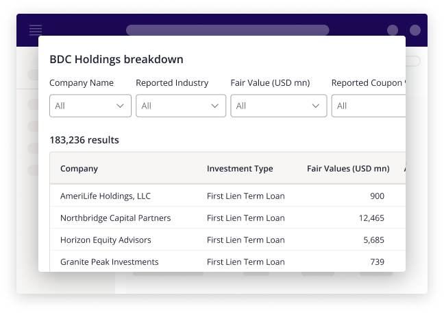 When viewing individual fund profiles, BDC holdings data (where available) will be under the ‘Deals/Assets’ tab. Explore the underlying loans and filter by company name, industry, fair value, maturity date, investment type, and more.