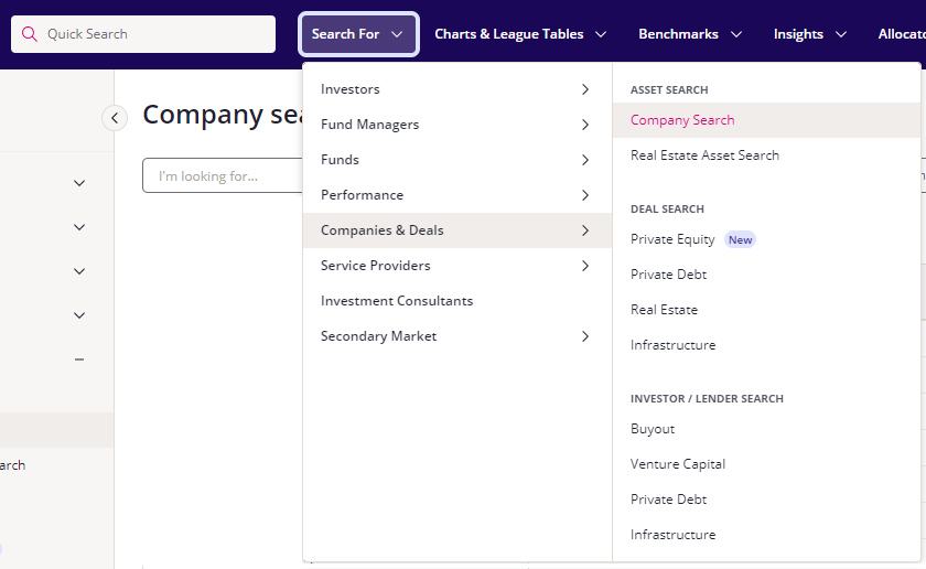 Go to ‘Search For’ > ‘Companies & Deals’ > ‘Company Search’.