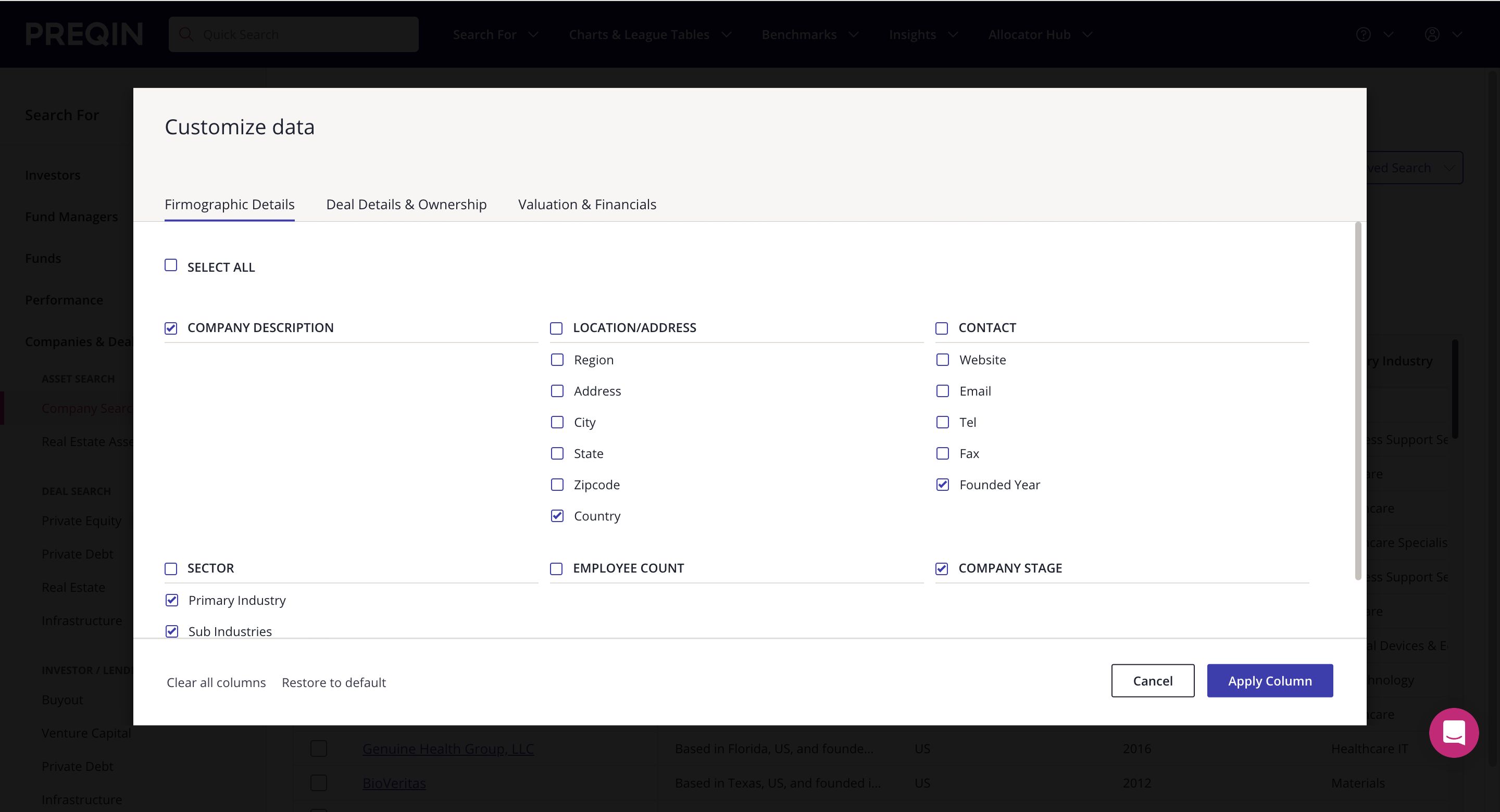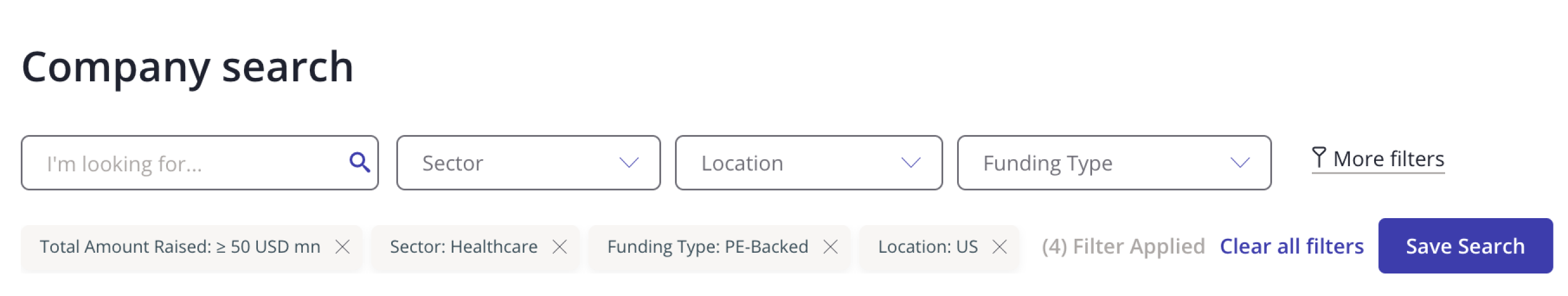 Apply filters to display companies aligned to your strategy. For example, ‘US’, ‘Healthcare’, ‘PE-backed', and ‘>$50m raised’. You can also add filters for criteria such as fund characteristics, company stage, company financials, employee data, ESG metrics, investors, and more.
