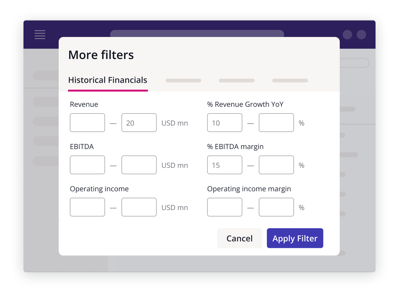 Apply a series of financial filters to find potential add-on companies. For example: