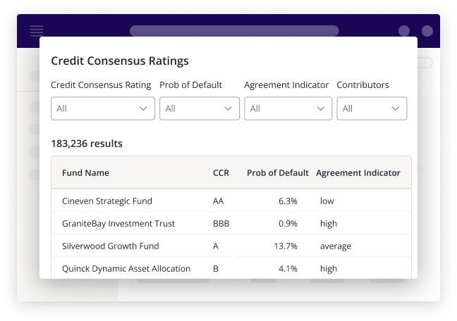 Utilize Credit Consensus Ratings to provide an independent measure of risk on rated and unrated entities globally, for greater transparency over your investment process. Search for credit ratings within the investor, fund manager, fund, and company search from the main navigation – and narrow down your results table by using key filters including credit consensus rating (AAA-D), probability of default, agreement indicator, contributors, industry, country, and other firm-specific filters.