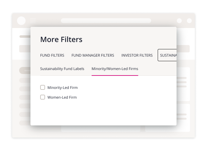 Identify investors with an interest in sustainable investing and a track record of committing capital to firms led by women and minorities, or to sustainability fund labels and themes such as SFDR, climate, energy transition, and others.
