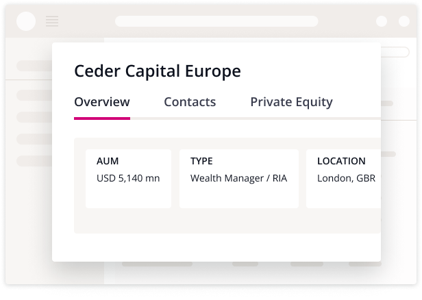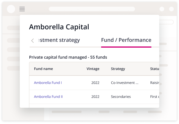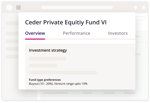 A fund profile offers specific information on the investment vehicles managed by GPs, including deal and performance information and visibility on which allocators are involved.