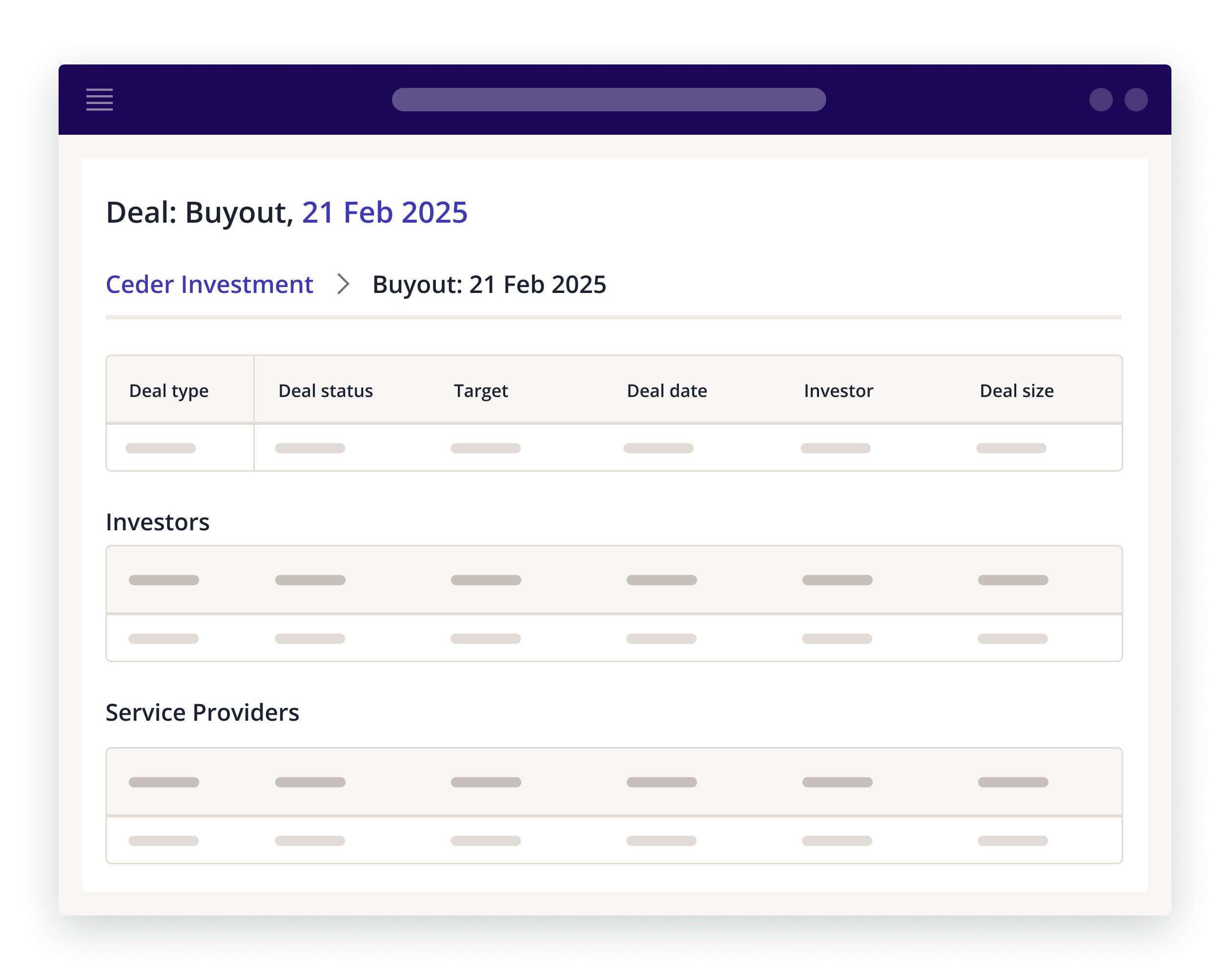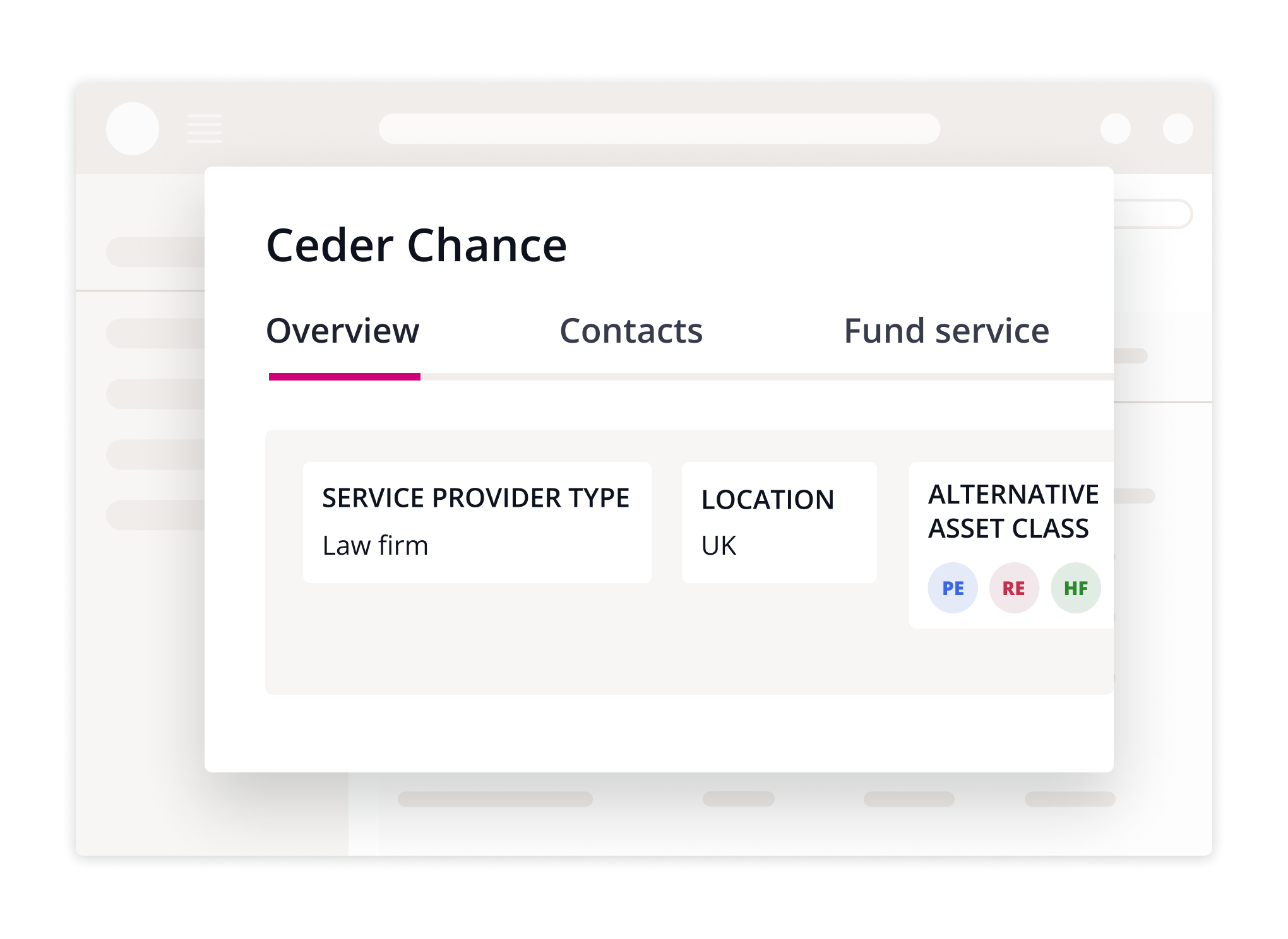 Service Providers: Shows any fund or transactional service providers that worked with the GP and the particular funds or deals they worked on.