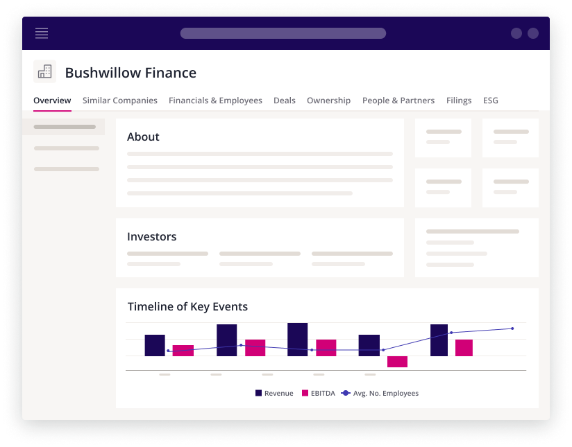 Overview: Covers key background information, a snapshot of their private market activity, addresses, and their full portfolio overview.