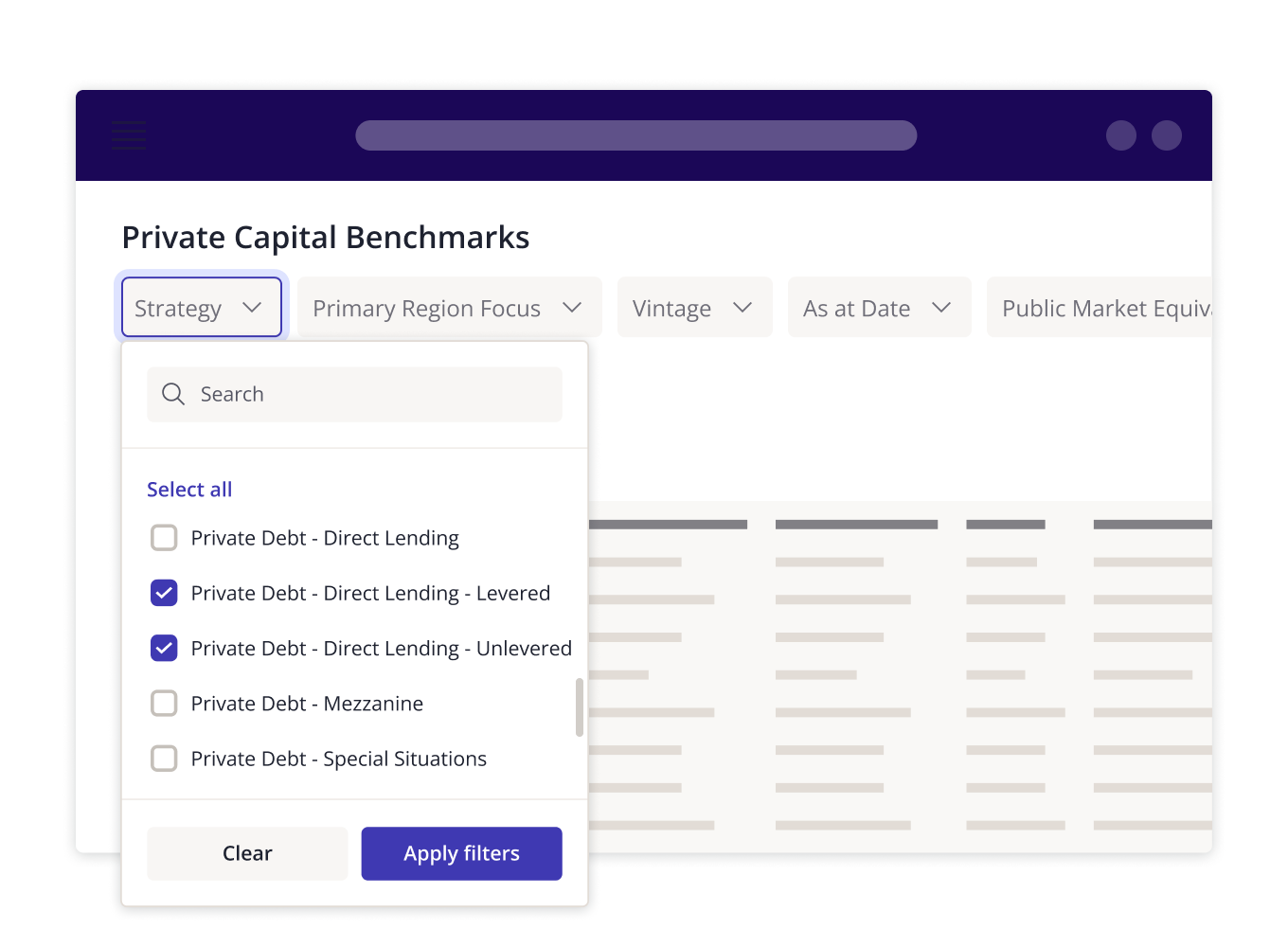 Conduct detailed due diligence and like-for-like comparisons with access to private lending benchmarks for levered and unlevered fund performance. With this addition, you can now evaluate and analyze direct lending performance more accurately.