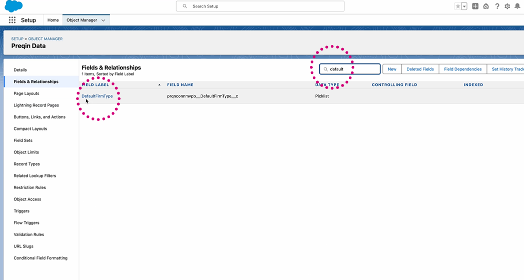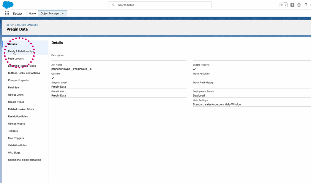 Navigate to Setup > Object Manager. Then click on 'Preqin Data' Custom Object