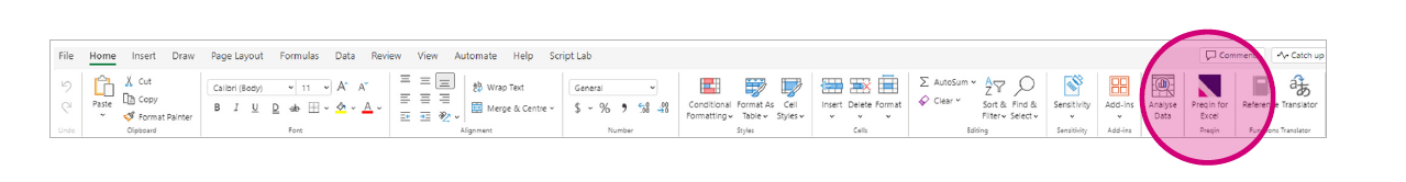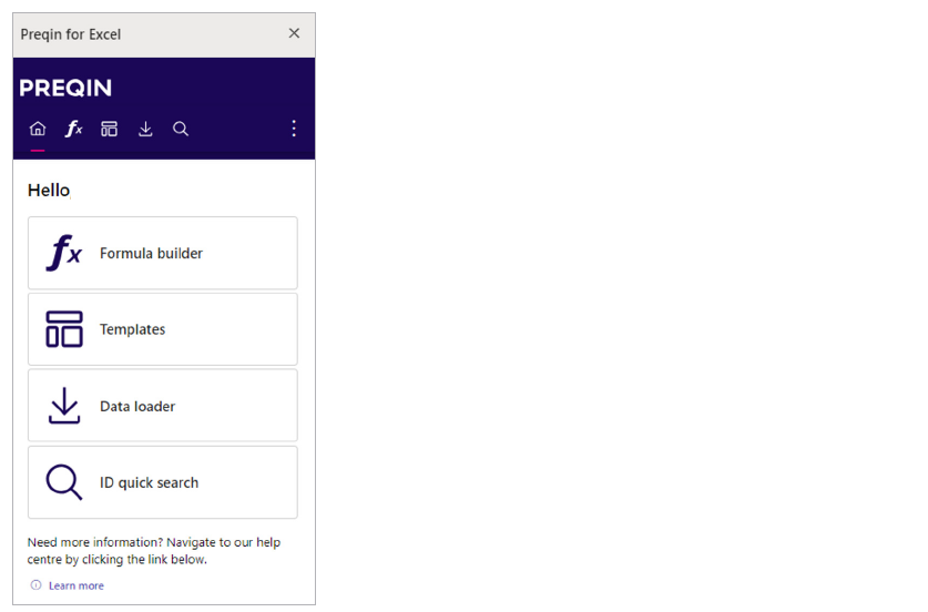 Once installed, a Preqin for Excel button will appear in your Home Excel menu. From this pane you can access all the Preqin features that are available in Excel.
