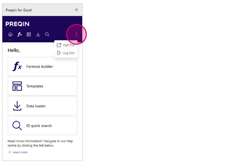 1. By clicking on the three dots in the top right corner of the plugin, you can log out of Preqin for Excel.