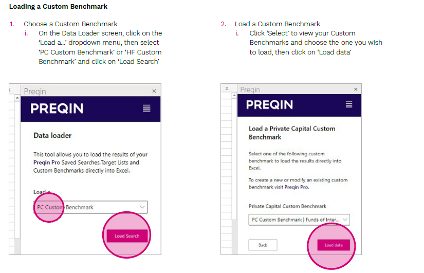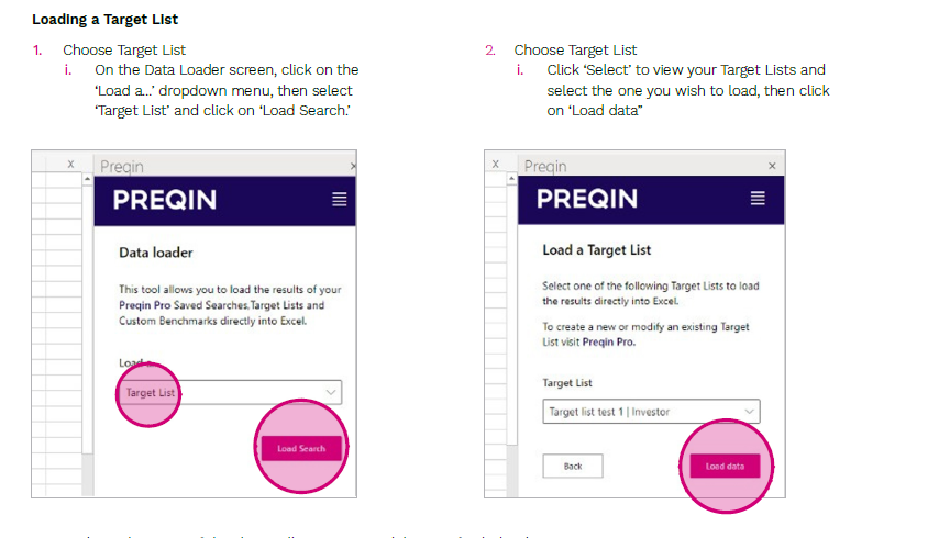 Preqin for Excel’s Data Loader allows you to access predefined Saved Searches, Target Lists, and Custom Benchmarks directly in Excel, without needing to navigate to Preqin Pro to export.