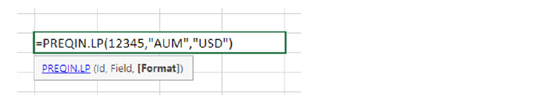 =PREQIN.LP(12345,”AUM”,”USD”)