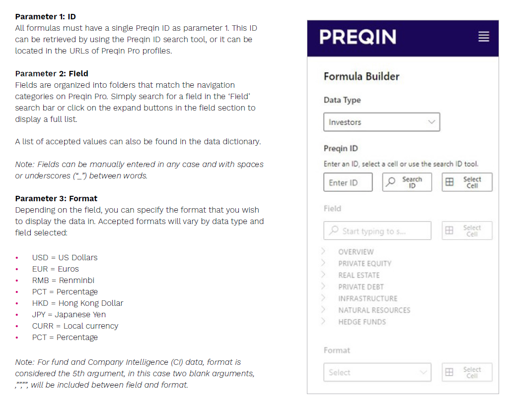 There are multiple formulas on Preqin for Excel, each based on the different ‘Data Types’ available.