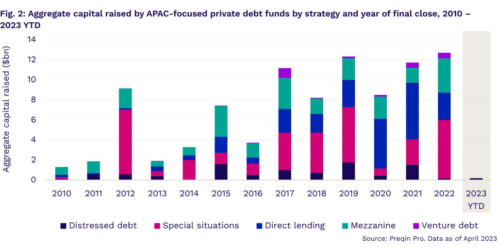 Previously, APAC-based private debt fund managers preferred to invest in distressed debt opportunities through special situations funds, which allow them to employ blended strategies. Special situation funds capitalize on events that cause securities to trade at lower valuations. They can loosely be used to acquire distressed debt, which are discounted, high-risk debt securities in default, or which bear a significant chance of defaulting. Seven APAC-focused special situations funds raised $5.8bn in 2022, doubling the $2.5bn raised in 2021 (Fig. 2). The difference was driven by two significant funds, Bain Capital's Special Situations Asia II and Asia Pacific Special Situation Fund, which closed at $2.1bn and $2.0bn, respectively. According to Bain Capital, the Special Situations Asia II fund has an opportunistic mandate, pursuing special situations and distressed debt in China, India, Australia, and South Korea.