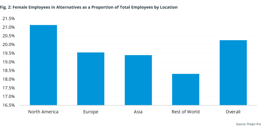 Our 2021 study found that less than a quarter of people working in alternative assets are women. Senior ranks in particular lack female representation: women accounted for just 12.2% in 2021 (up from 11.9% in 2020) – and there isn’t a huge amount of regional variation, either (Fig. 1).