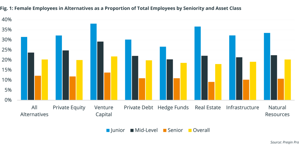 Interestingly, Preqin’s 2021 Women in Alternative Assets report showed that venture capital also has the highest levels of female employees when compared to other asset classes (Fig. 2). This could also explain why venture capital has the largest proportion of women in senior roles.