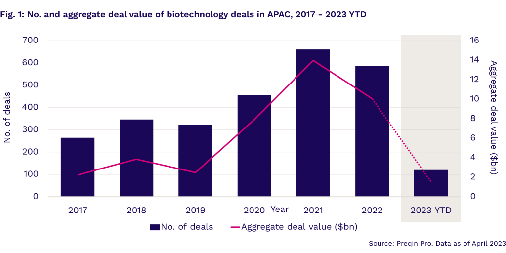 Venture capital deals in the biotechnology sector skyrocketed in both number and value when the pandemic started spreading globally during 2020. Globally, an average of near 1,531 biotech VC deals were completed between 2020 and 2022, averaging at a total of $43.7bn per year. The aggregate value more than doubled compared to 2019’s $19.4bn. In APAC, 587 deals were completed with a total value of $10.0bn in 2022, accounting for 26% of global deal value, up from just 13% in 2019 (Fig. 1).