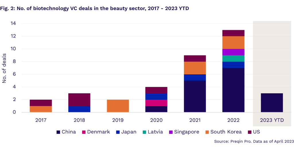 Since then, biotech deals have ventured beyond COVID-19 vaccines and medications, into fields such as beauty and wellness, cancer treatments, and novel gene therapies. Notably, there has been an increase in deals in the currently booming beauty sector in the APAC region, as venture capitalists spot potential in growing consumer demand from the region’s expanding and increasingly affluent middle class.