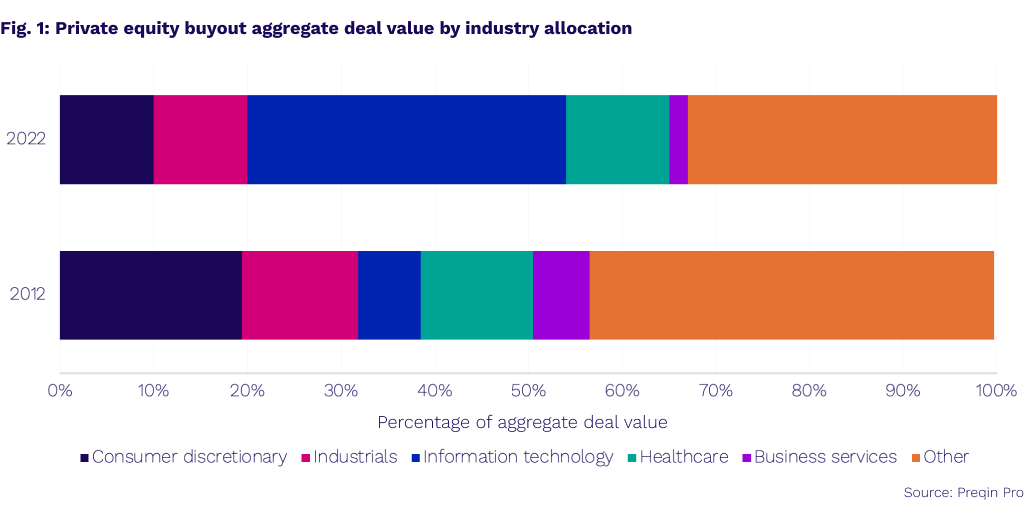 The breakdown of deal flow by sector tells a very different story in 2022. Private equity buyout deals over the last twelve months show significantly less sector diversification, with tech accounting for a third of all aggregate deal value. Though stark now, the shift toward IT has occurred somewhat gradually.