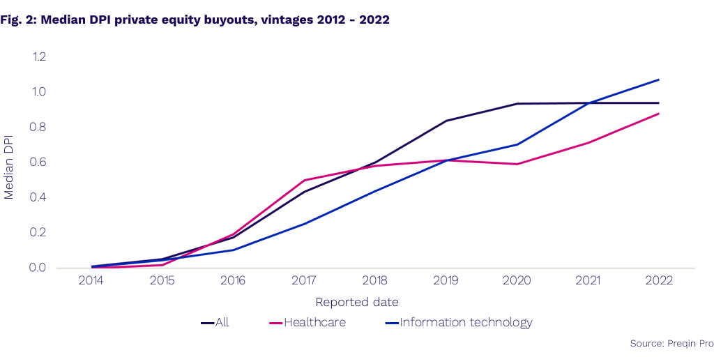 To explore this, we looked at the median Distributed to Paid-In Capital (DPI), or the ratio of investor capital returned to them relative to their initial investment, for deal vintages 2012 to 2020. The aggregated numbers helped us examine the rate at which buyout deals from over the past decade distribute capital back to LPs. Along with the DPI figure, we looked specifically at the information technology and healthcare industries, as well as the broad buyout market as a benchmark. Tech and healthcare share similar characteristics as both are research-based and concerned with the long-term outlook of their expected revenues.
