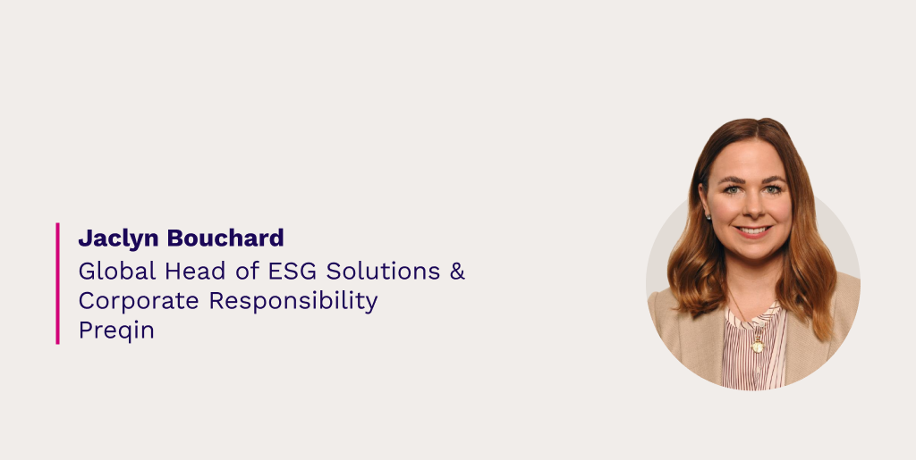 I’m Jaclyn Bouchard, Head of ESG Solutions & Corporate Responsibility at Preqin. I lead a talented, global team of passionate sustainability professionals across product, marketing, research, and more to create and deliver innovative ESG data products that compel transparency in a market that is inherently opaque.