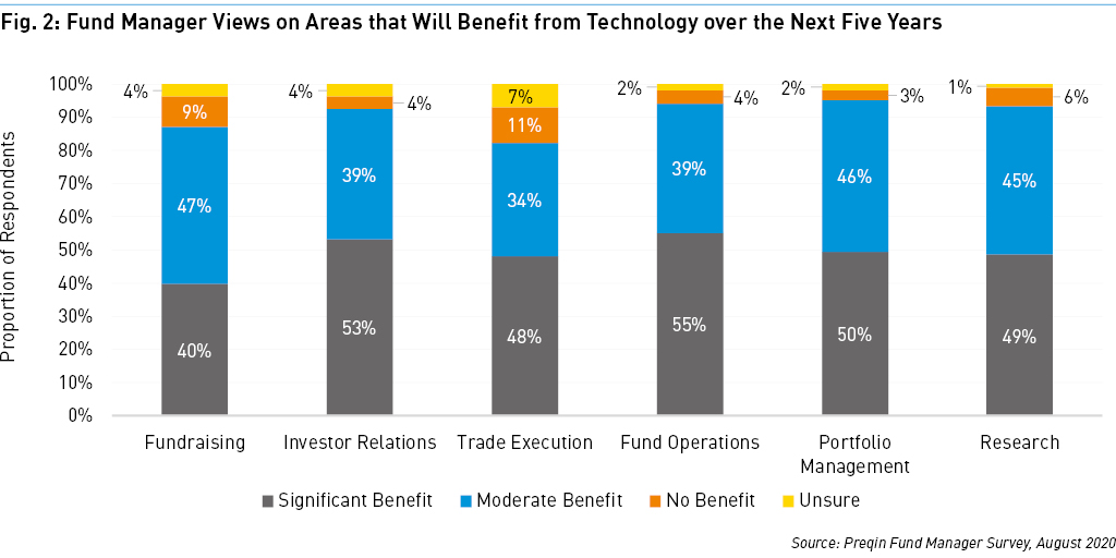 Outside of fund operations and portfolio management, investor relations are another area that could benefit significantly from the use of technology over the next five years (Fig. 2). Some respondents are planning to use AI to automate interactions with existing and potential LPs; the client insights they glean from models enables them to be more targeted in sales and marketing efforts. Some managers are using predictive algorithms to identify specific product cross-sell opportunities, while others have algorithms that can identify clients at risk of redemption for specific strategies, according to McKinsey.
