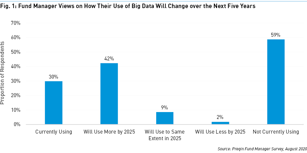 While data-driven models have been used by many quantitative hedge funds for years to find new sources of alpha, and some private equity firms are also using big data to inform their investment decisions, this technology is still very new to most. A majority (59%) of fund managers polled by Preqin for Future of Alternatives 2025 do not currently harness big data in any way (Fig. 1). We will see an increase in the adoption of machine learning and other data-processing techniques over the next five years: 42% of respondents say they will use big data more by 2025.