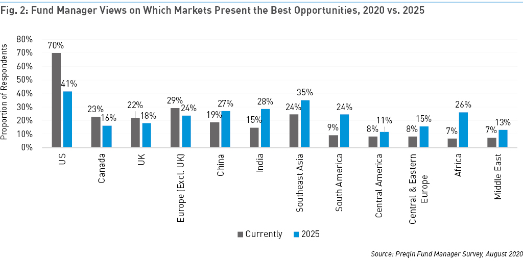 Although the majority of investors we surveyed for Future of Alternatives 2025 do not invest in Latin America, 12% of respondents that do not currently invest in the region plan to start by 2025. What’s more, while only 9% of fund managers believe South America is presenting the best investment opportunities at present, almost a quarter (24%) see some of the best opportunities in 2025 (Fig. 2).