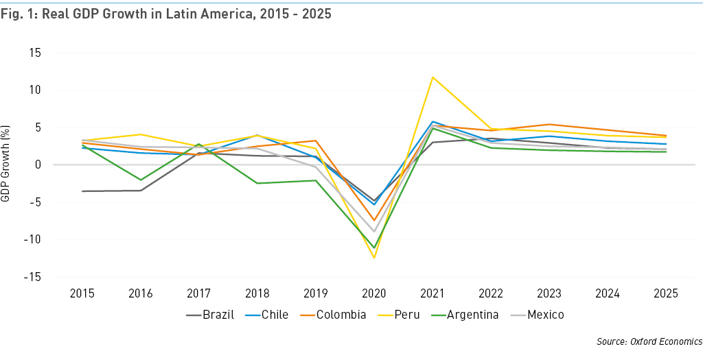 Ongoing macroeconomic challenges may depress expected returns from Latin American assets and accelerate the shift to investments further afield. Indeed, COVID-19 has hit the region disproportionately hard: Chile, Peru, and Brazil have all recorded more cases per million than the US after 70 days from their respective outbreaks. While the region’s largest economies are expected to rebound next year from severe slowdowns in 2020, forecasts for GDP growth of between 2.2% in Mexico and 3.9% in Colombia for 2025 are modest by emerging market standards (Fig. 1).
