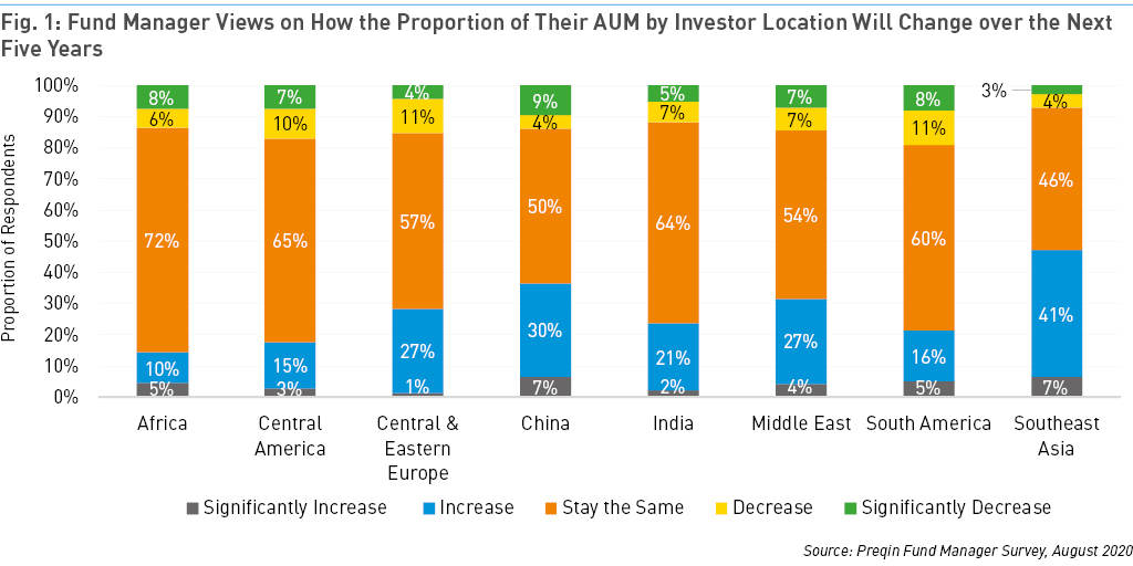 Fund managers are most bullish about their prospects of raising capital from Southeast Asia, with China in second place. Nearly half (48%) of managers surveyed for Future of Alternatives 2025 expect Southeast Asia to account for a greater proportion of their assets under management (AUM) over the next five years (Fig. 1).