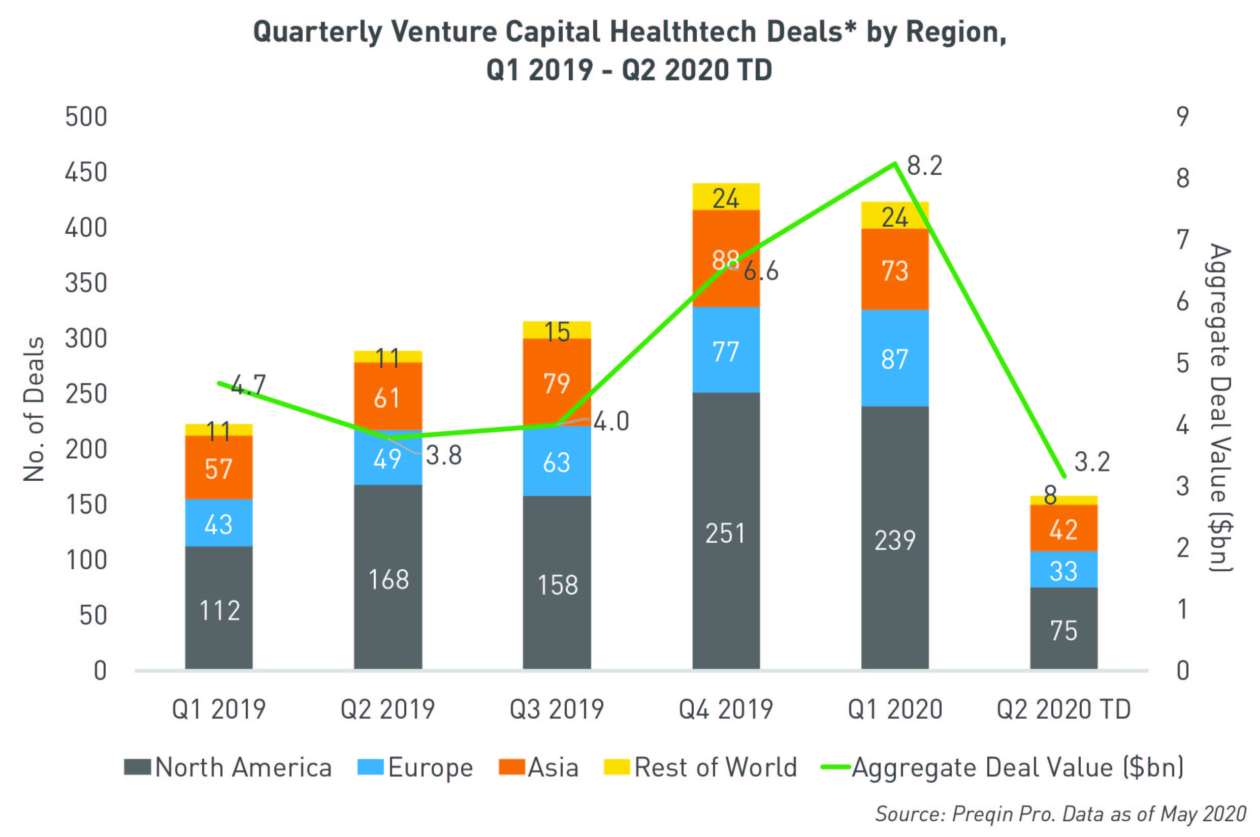 Venture capital investment in healthtech hit $8.2bn in Q1 2020, the highest quarterly total on record – and large deals continue to be made