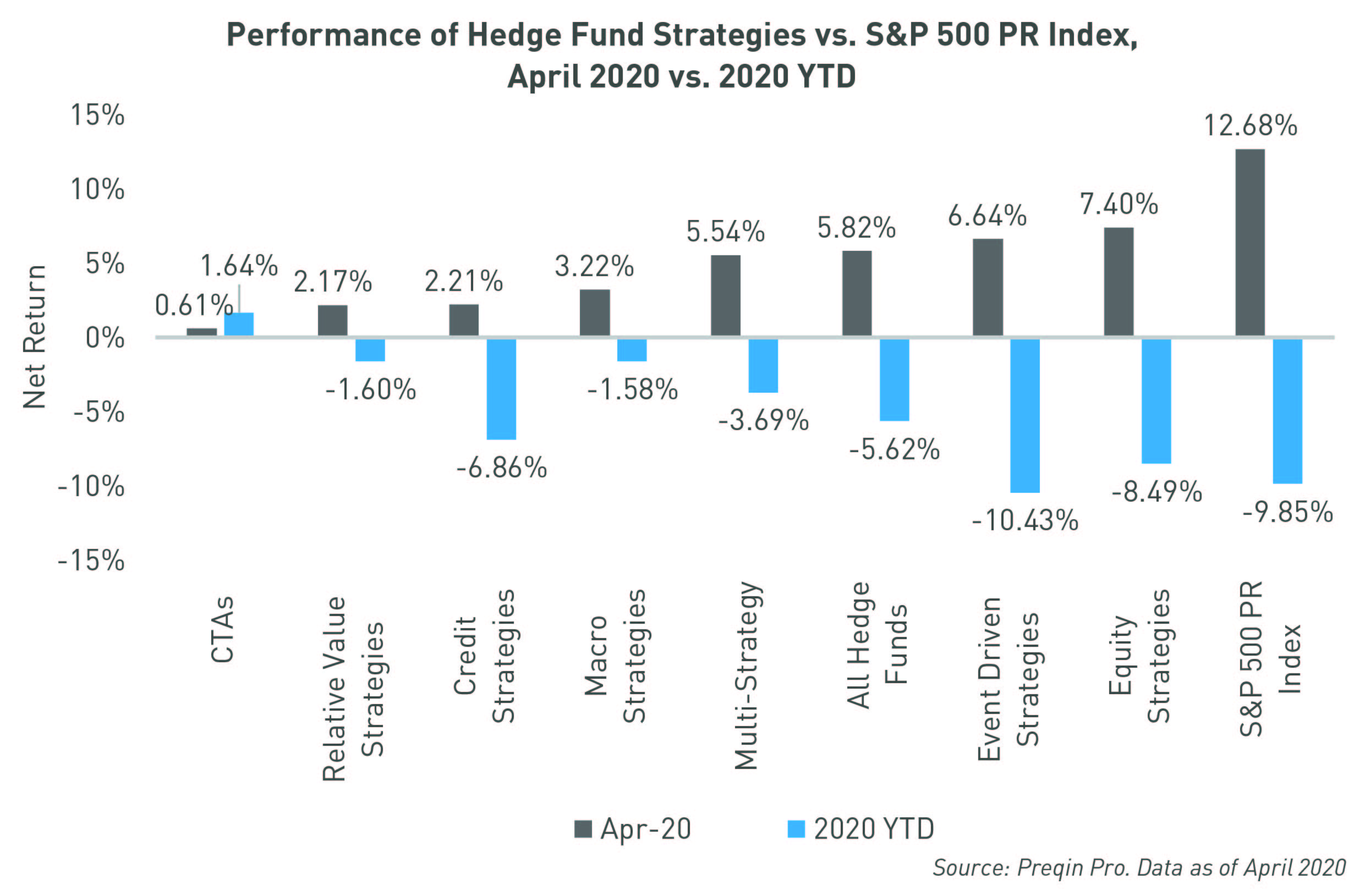 Although returns surged in April, hedge funds remain underwater in 2020. Hedge funds have lost 5.62% in 2020 up to 30 April, with performance not yet recovered from a Q1 loss of 10.94%. While investors will have welcomed these improved returns, they will be expecting hedge funds to capitalize on any further recovery in 2020. And with public markets continuing to rally – the S&P 500 produced a return of +4.53% in May – hedge funds may be completing their comeback sooner rather than later.