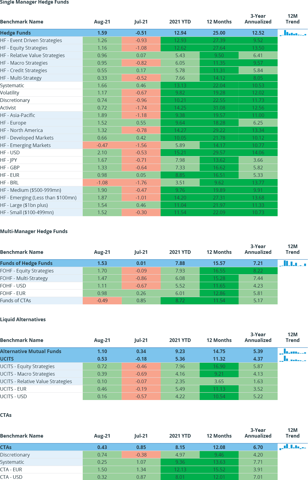 This heatmap presents the hedge fund performance benchmarks for August 2021. Plus, the YTD and 12-month returns for all top-level strategies, structures, denominations, and size classifications.