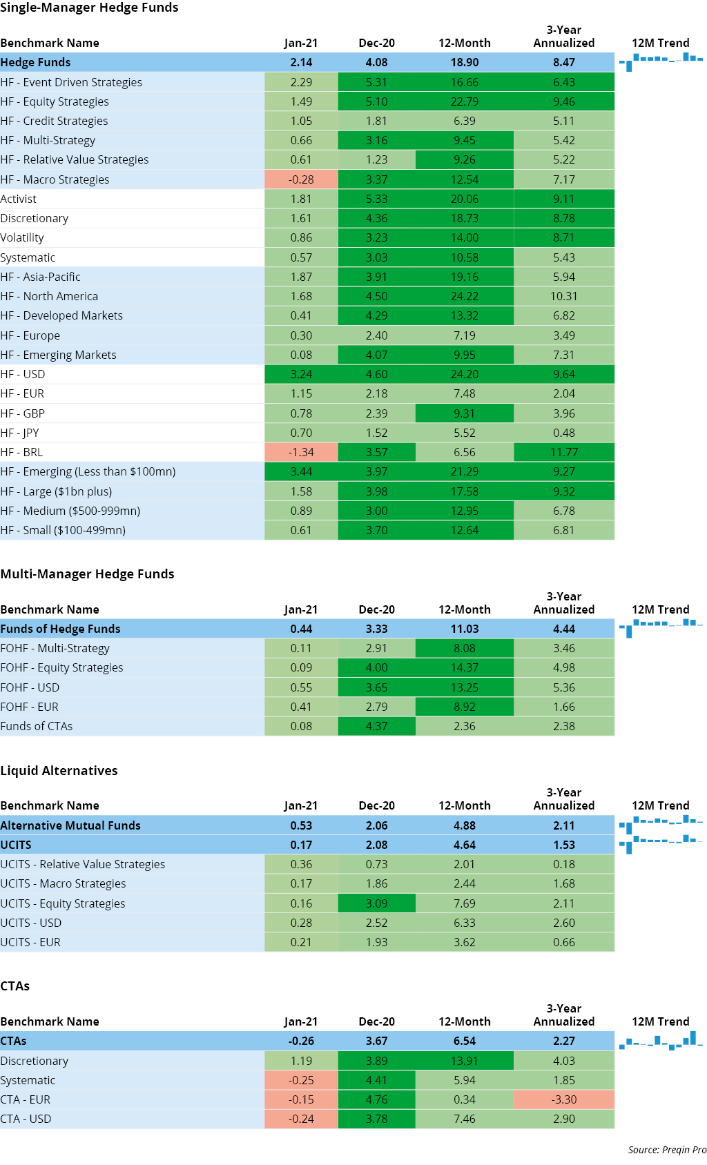 The Preqin All-Strategies Hedge Fund benchmark returned +2.14% in January, building on December's 4.08% gain and pushing the 12-month return to +18.90%.
