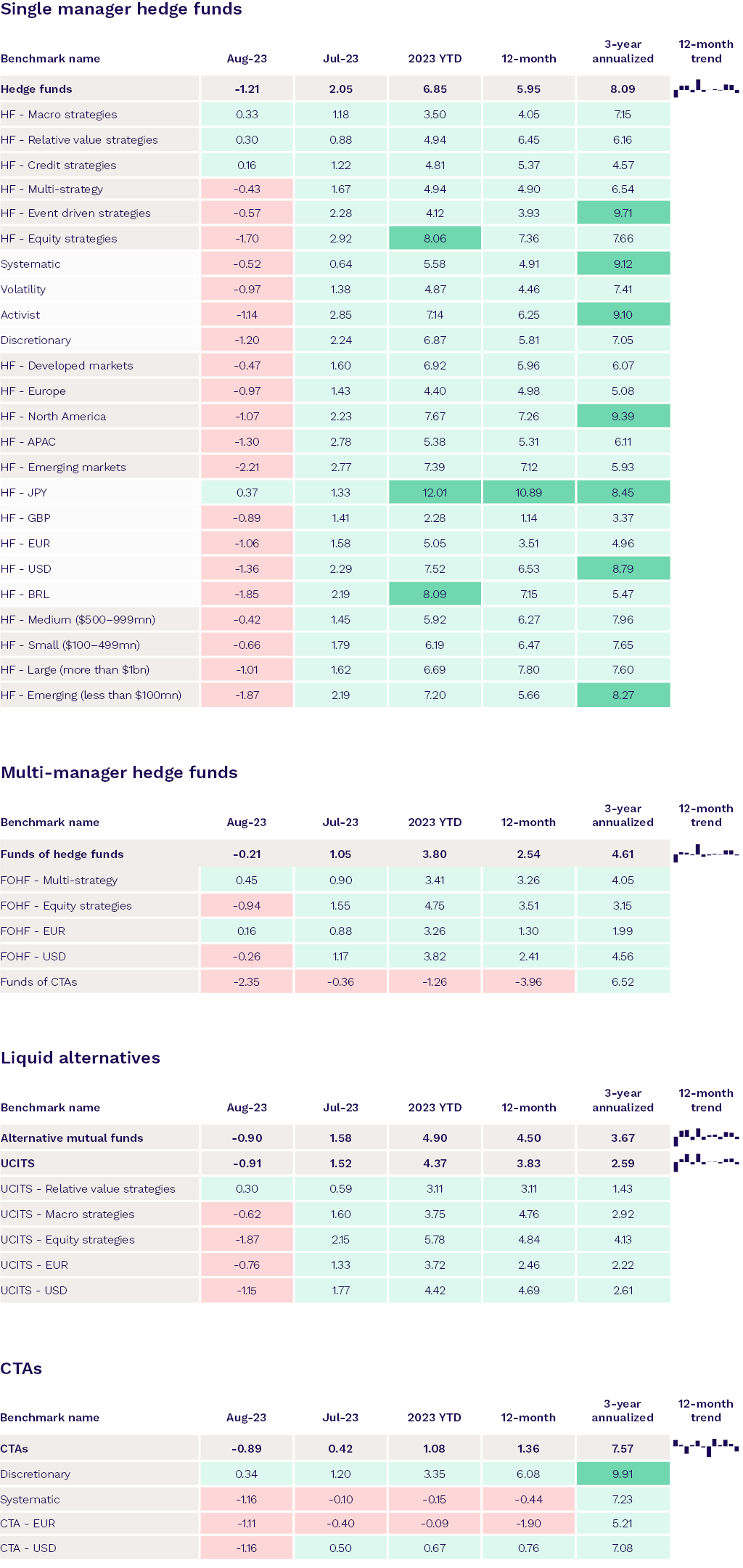 This heatmap presents the hedge fund performance benchmarks for August 2023, plus the YTD, 12-month, and 3-year annualized returns for all top-level strategies, structures, denominations, and size classifications.