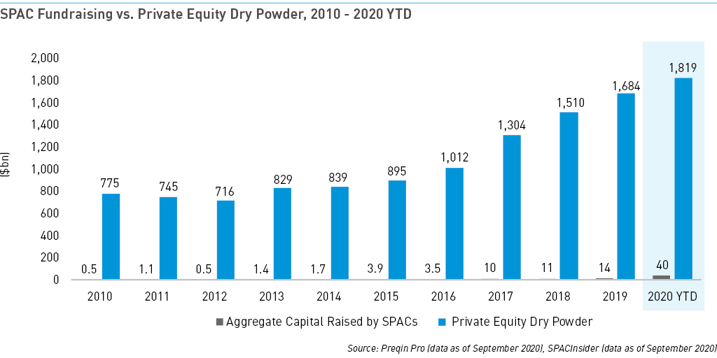 2020 has been described as the “Year of the SPAC,” but capital raised by these vehicles is less than 4% of the dry powder available to buyout funds