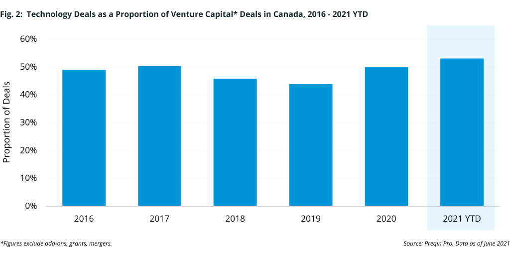 Average deal value in Canada has spiked in the first half of 2021 (Fig. 1). This is consistent with the global deals trend and that of its southern neighbor, although with fewer deals and higher entry prices. Behind these transactions are predominantly tech-focused software, internet, and cybersecurity companies, which were involved in many of the top deals and remain the chief drivers of venture capital-backed innovation in Canada.