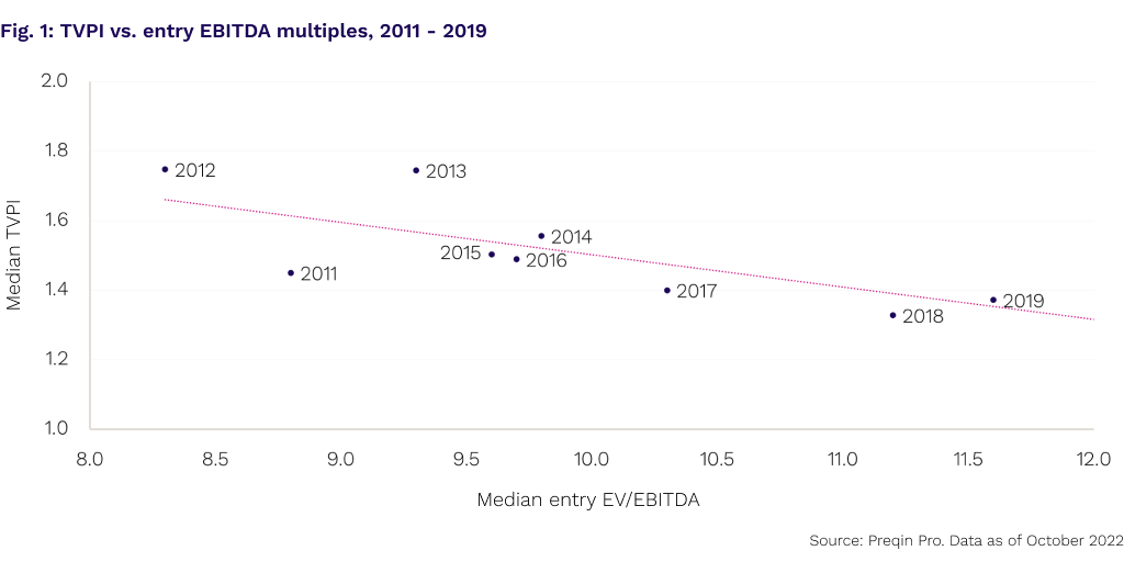 This included the price of entry. As ticket prices rise the eventual exit prices will need to rise the same for returns to keep pace. Recent history shows that low-entry multiples can present a long runway for asset performance (Fig. 1) with a pronounced negative correlation between entry values and value returned to investors. While more recent deals may be less mature, the market they close in will influence how they perform down the line.
