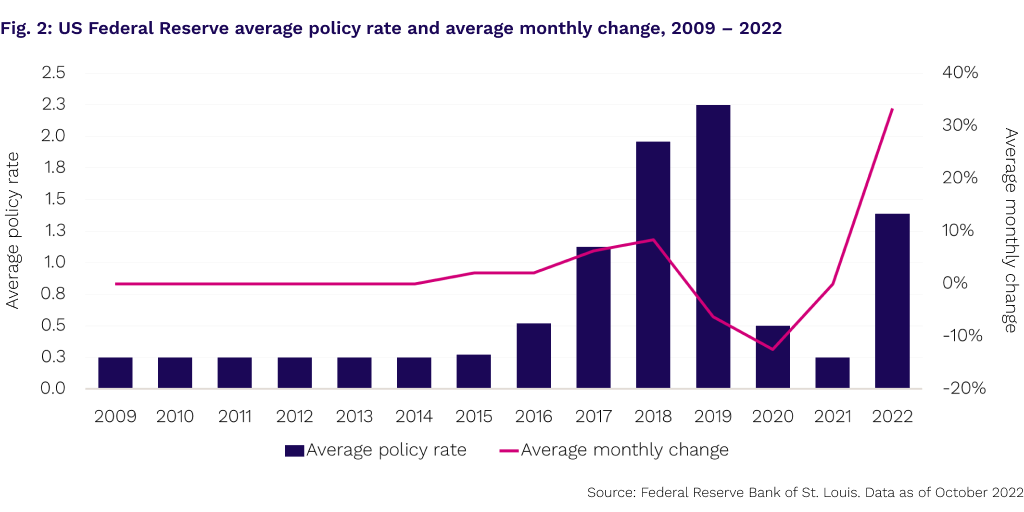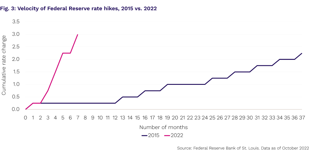 Vintages of the best-performing buyout deals also coincided with the low-rate environment (Fig.2). Aggressive interest rate policies have led to very sharp increases in base rates. While the hikes that began in December 2015 took 37 months to reach a peak of 2.5%, so far this year it’s taken just 7 months, from March 2022 to September 2022, to climb from 0.25% to 3.25% (Fig. 3). And further increases are not out of the question. US inflation, the key driver of this year’s rate increase has shown few signs of slowing, with the most recent year-over-year change reported at 8.2% for September 2022.
