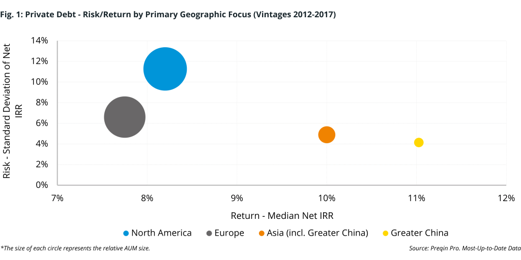 International money managers are increasingly warming up to the opportunity in Greater China-focused private debt, which includes direct lending, mezzanine financing, distressed, and special situations strategies. Diversification is a big driver behind the rising demand for private debt in China, but so is performance. As Fig. 1 shows, Greater China-focused private debt funds of vintages 2012-2017 have produced a net IRR of 11.0%, beating their peers in North America (8.2%) and Europe (7.8%). Private debt funds focused on Asia as a whole generated a net IRR of 10.0%.