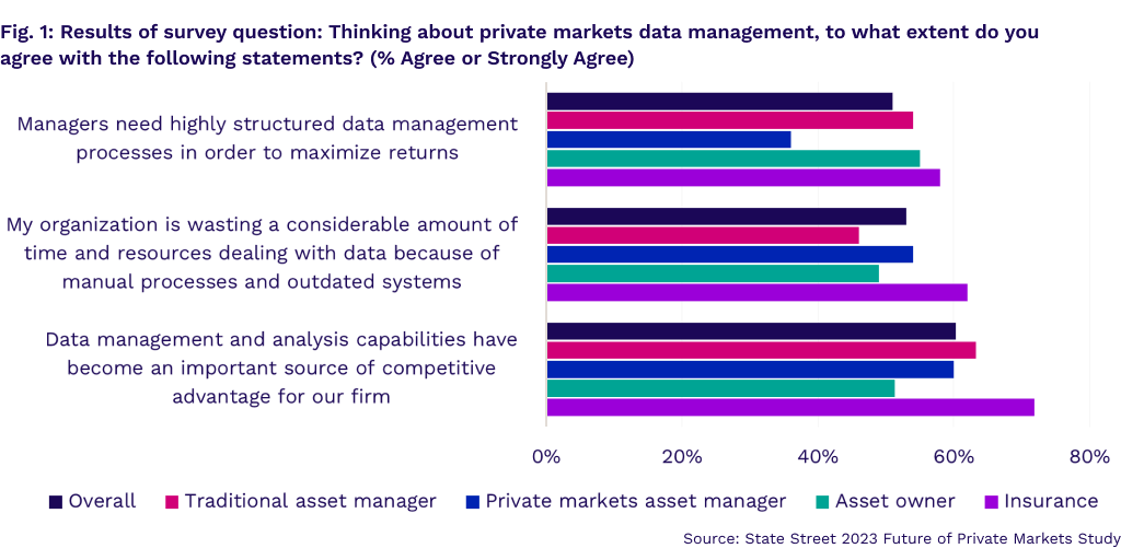 Higher interest rates also mean higher yields on traditional fixed-income and cash, putting further pressure on expected returns for private markets investments. Against this backdrop, it is not surprising that most respondents to the State Street 2023 Future of Private Markets Study described 'manual processes and outdated systems' for managing data as a 'considerable' waste of their time and resources. On the other hand, a similarly significant proportion said improving their data management and analysis capabilities gave their organization a 'competitive advantage'.