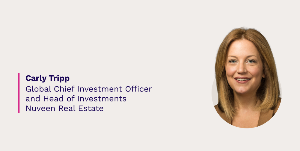 Carly Tripp is Global Chief Investment Officer and Head of Investments for Nuveen Real Estate. Nuveen Real Estate is one of the world’s leading investment managers with $156bn in assets under management. Globally, she leads a team of 200+ investment professionals responsible for all transactional and asset management functions. Carly is also a member of the Global Executive Leadership team.