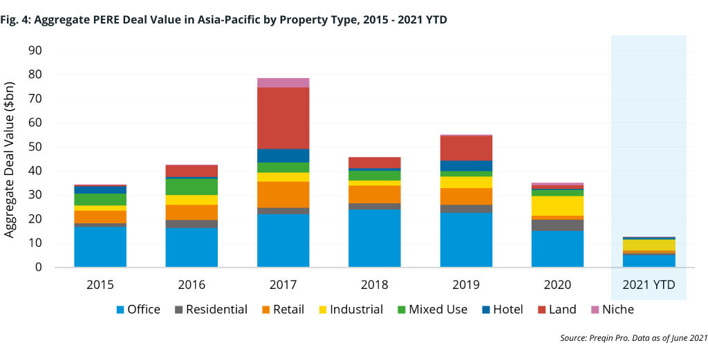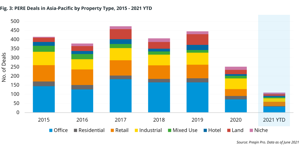 Anticipation of robust capital flows and investor interest are one thing, but living up to expectations and proving the long-term validity of traditional property portfolios are quite another. Despite the record level of dry powder ($52bn) earmarked for deployment in the region, real estate deal-makers have been cautious to return to the negotiating table. Private equity real estate (PERE) deals in Asia-Pacific took a beating last year, falling more than 36% to an aggregate value of only $35bn across 251 transactions in 2020 (Fig. 3).