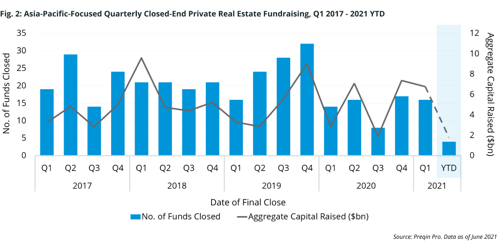Moreover, despite hitting a rough patch last year, during which time just $19bn was raised across 55 funds, fundraising looks to be slowly picking up. Real estate funds focused on Asia-Pacific secured $6.8bn in the first quarter of 2021, registering a 142% increase compared with the same period last year (Fig. 2). While H1 2021 is not quite over, the $8.6bn in aggregate capital raised so far this year has already beaten out fundraising totals in both H1 2017 and H1 2019 – helping the asset class leave 2020 in the rear-view mirror.
