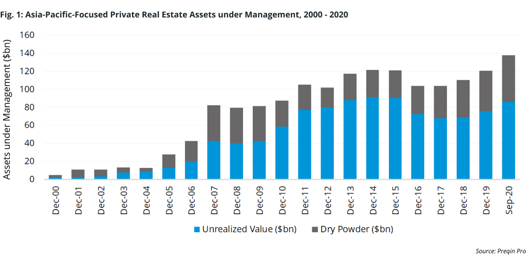 While change is never easy, there are reasons to be optimistic. The industry is showing resilience: Asia-Pacific-focused private real estate assets under management (AUM) hit a record-high $138bn as of September 2020 – a rise of more than 14% in just nine months during the height of the pandemic (Fig. 1).