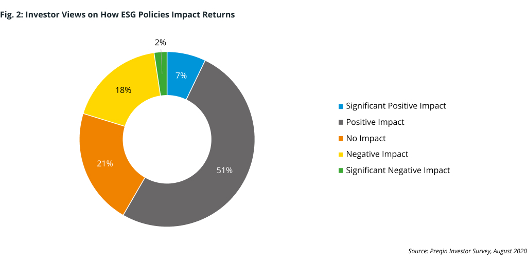Legislation will enforce measures that an increasing number of investors are already putting in place. While the Global Financial Crisis pushed ESG off the corporate agenda, COVID-19 appears to have entrenched the view that considering ESG factors enhances risk management. Crucially, a majority of alternatives investors surveyed by Preqin see ESG as having a positive (51%) or significant positive (7%) impact on returns, compared with 21% seeing no impact and 20% a negative or significantly negative impact (Fig. 2).