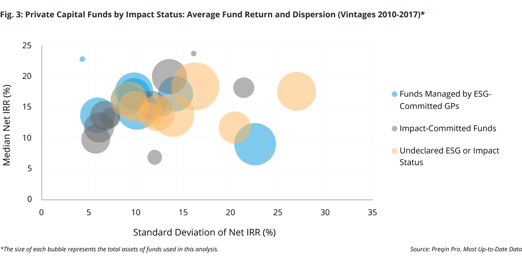 Preqin performance data on private capital funds validates investors’ views on ESG and performance, particularly from a risk/return perspective. We compared funds of vintages 2010-2017 (the most recent date where reported returns are meaningful) with an ESG or impact focus with those without, and our findings show there is no statistically significant difference in returns (Fig. 3). In fact, we can see a decrease in return variance across ESG-committed funds, indicating a reduced level of risk from manager selection for investors.