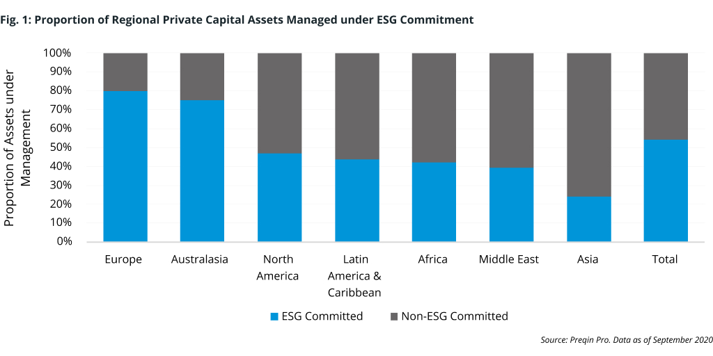 Legislation has been crucial in driving the sustainability agenda, and is largely responsible for the leadership of European institutions in the ESG field. Preqin data shows that 80% of private capital assets in Europe are managed under ESG commitment, compared with 47% in North America (Fig. 1). The Middle East (39% of AUM) and Asia (24%) have considerable ground to make up.