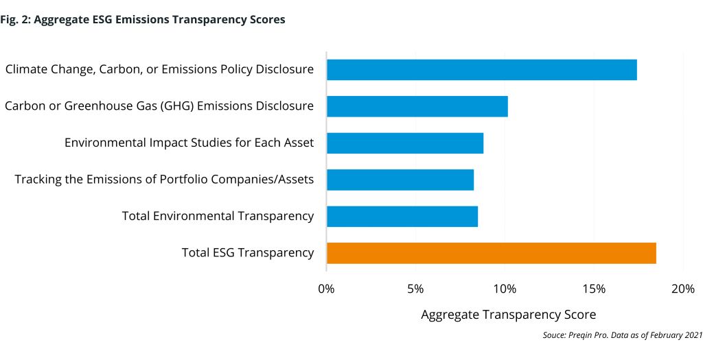 Preqin’s ESG transparency indicators show that many managers aren’t digging deep enough into environmental issues in their portfolios. While the aggregate transparency score¹ across the 4,000+ managers observed is 18.5%, only 11.2% (Fig. 2) of these managers are transparent on carbon emissions. Among that 11.2% of firms, most (17.4%) disclose any policy pertaining to climate change or carbon emissions at the governance level – action-oriented asset-level disclosures were even lower. When pressed on whether they evaluate assets’ ongoing emissions at the company level, conduct environmental impact studies of portfolio companies, or track asset emissions, only, 10.2%, 8.3%, and 8.8%, respectively, answered in the affirmative.